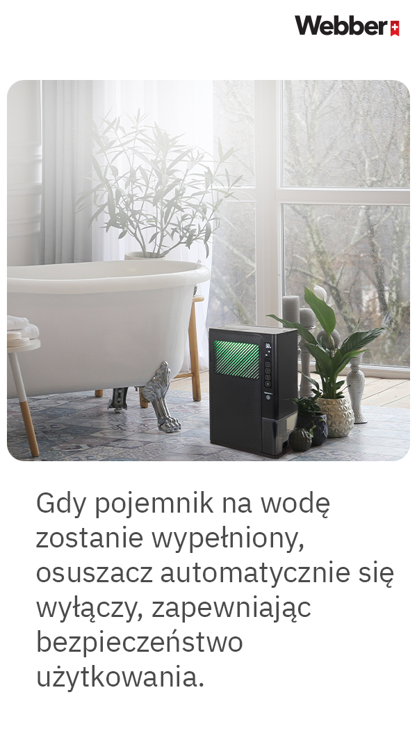 Gdy pojemnik na wodę zostanie wypełniony, osuszacz automatycznie się wyłączy, zapewniając bezpieczeństwo użytkowania.